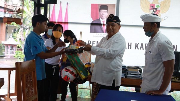 Persindonesia.com Jembrana – Sebagai bentuk kepedulian Pemerintah Kabupaten Jembrana terhadap Karang Taruna, Bupati Jembrana I Nengah Tamba serahkan sarana olahraga dan bendera Karang Taruna kepada 5 Karang Taruna se-Kabupaten Jembrana, Jumat (12/8/22). Bertempat di Rumah Jabatan Bupati Jembrana penyerahan tersebut dihadiri oleh Seluruh Camat Se-Jembrana dan Kepala Dinas Sosial Jembrana I Gusti Bagus Ketut Oka Parwata.