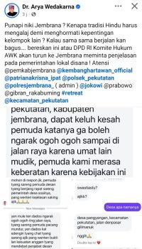 Persindonesia.com Jembrana – Seorang warga yang mengatasnamakan perwakilan dari salah satu desa di Kecamatan Pekutatan mengeluhkan kebijakan pembatasan arak-arakan ogoh-ogoh saat Hari Pengerupukan Nyepi. Keluhan tersebut disampaikan melalui akun media sosial dr. Arya Wedakarna, menyebut bahwa mereka merasa dilarang mengarak ogoh-ogoh ke jalan raya karena adanya arus mudik umat lain. Warga pun menyatakan keberatan atas kebijakan tersebut.