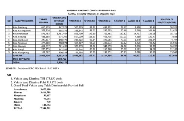 Ia membeberkan capaian Vaksinasi di Bali sampai dengan 11 Januari 2022 mencapai 102,77 % untuk Vaksin Dosis 1 dan 91,46 % untuk Vaksin Dosis 2.