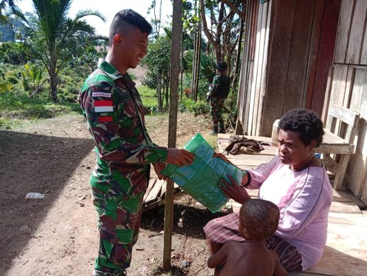 Papua –  Upaya mencegah dan mengurangi angka penyebaran penyakit malaria di wilayah perbatasan Papua, Pos Somografi Satgas Pamtas RI-PNG Yonif 126/KC bagikan kelambu kepada warga Kampung Somografi Distrik Web, Kabupaten Keerom.