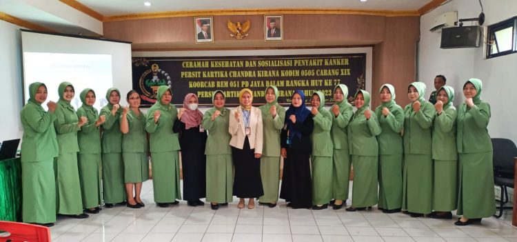 Persindonesia.com Jakarta Timur, Kodim 0505/Jakarta Timur bekerja sama dengan Yayasan Pemerhati Kanker Indonesia menggelar sosialisasi penyakit kanker bagi anggota TNI, PNS dan Persit Kartika Chandra Kirana Cabang XIX Kodim 0505 Koorcab Rem 051 PD Jaya bertempat di Aula Makodim, Jumat (17/02/23).