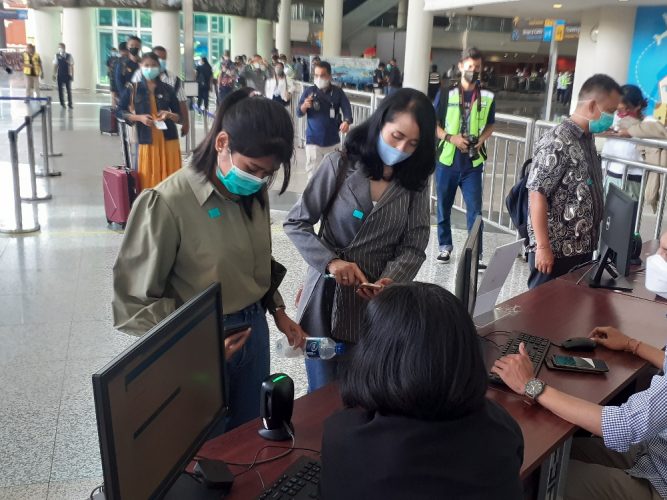 Denpasar – Sekretaris Daerah yang juga selaku Ketua Harian Ketua Harian Gugus Tugas Percepatan Penanganan Covid-19 Provinsi Bali Dewa Made Indra memantau pelaksanaan simulasi penerimaan penumpang dari luar negeri yang berlangsung di terminal kedatangan internasional Bandara Internasional I Gusti Ngurah Rai, Sabtu (9/10/2021).