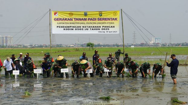 Jakarta Utara,Persindonesia.com — Dalam rangka mendukung program Pemerintah di bidang ketahanan pangan, Komando Distrik Militer (Kodim) 0502/Jakarta Utara menggelar kegiatan Tanam Padi Serentak bersama Gabungan Kelompok Tani (Gapoktan) Rorotan Jaya, bertempat di wilayah Rorotan, Jakarta Utara, Rabu (30/04/2025).
