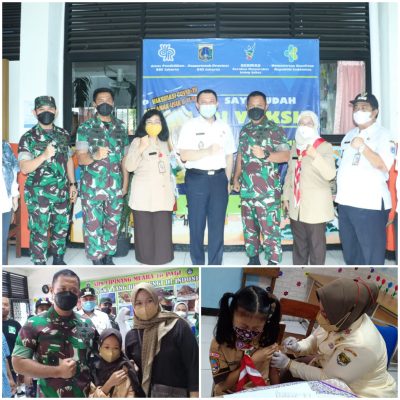 Upaya percepatan program Serbuan vaksinasi untuk memutus penyebaran virus Covid 19, Dandim Kolonel Inf Persada Alam mendampingi Pangdam Jaya Mayjen TNI Untung Budiharto meninjau langsung kegiatan vaksinasi tahap 1 usia 6-11 tahun di dua lokasi tempat yaitu SDN Cipinang Muara 17 Kecamatan Jatinegara dan SDN Utan Kayu Selatan 17 Kecamatan Matraman, Rabu (12/01/2022).