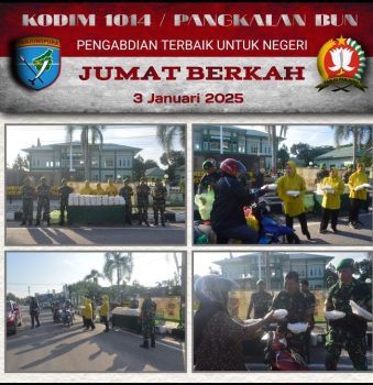 Pangkalanbun kobar – Persindonesia.com Dalam rangka mempererat tali silaturahmi terhadap masyarakat.Anggota Kodim memberikan bantuan kepada masyarakat, Komandan Kodim (Dandim) 1014 Letkol INF Makin S,SOS,. M,I,P,. Beserta ibu Persit dan anggotanya , menggelar acara pembagian nasi kotak Jumat Berkah di halaman Makodim Jl.Pangeran Antasari. Pangkalanbun Kobar. Jumat (3/01/2025)