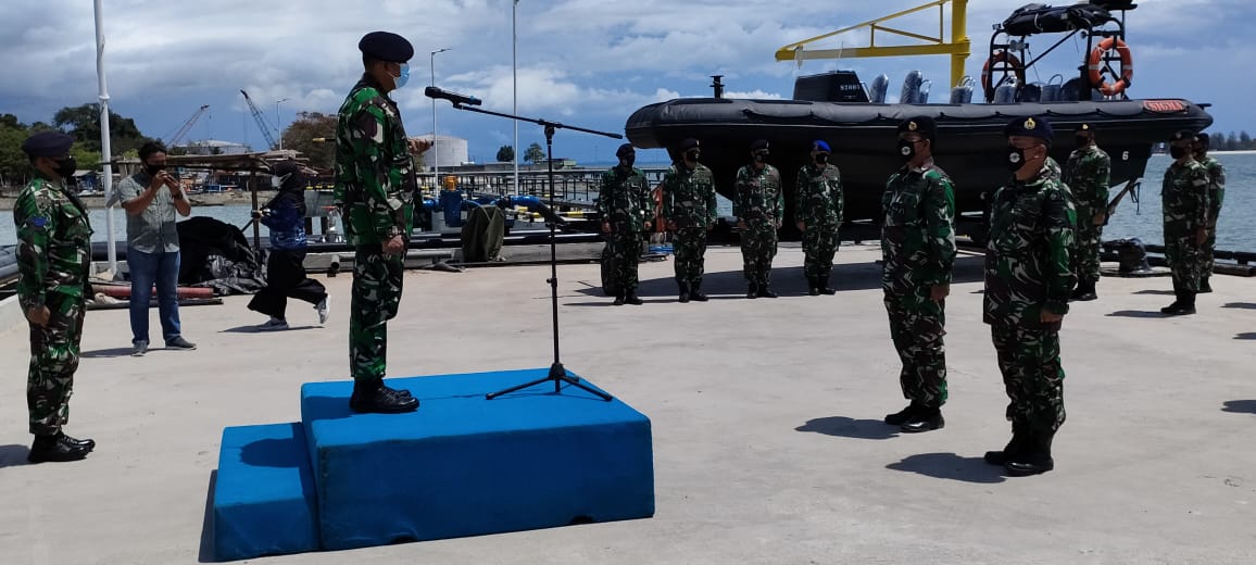 BELINYU — Komandan Lanal Babel Kolonel Laut (P) Dudik Kuswoyo,S.E.,M.Tr.Hanla memimpin upacara peluncuran dan pengukuhan Rigid Hulled Inflatable Boat (RHIB) salah satu Kapal Patroli Cepat di Dermaga Tarsus/RWTJM Belinyu Kelurahan Mantung Kecamatan Belinyu Kabupaten Bangka, Senin 22/03/2021.