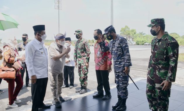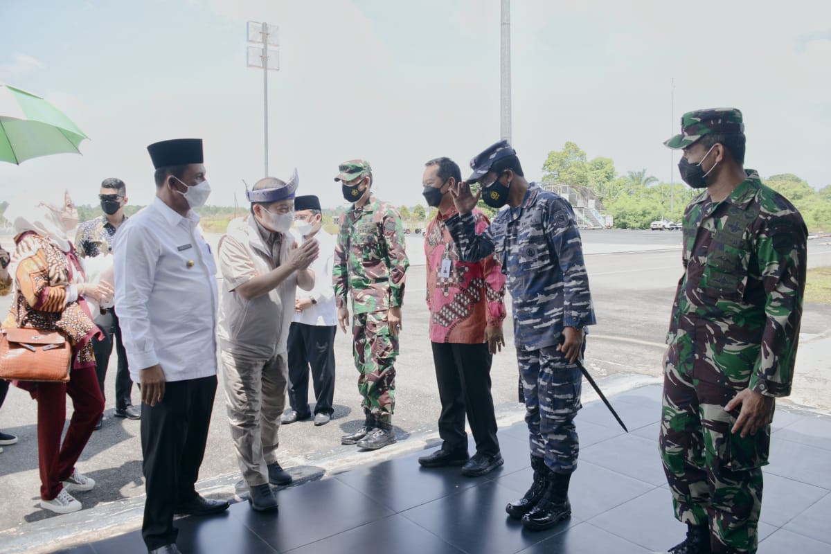 Komandan Pangkalan Utama TNI Angkatan Laut IV (Danlatamal IV) Tanjungpinang Laksamana Pertama TNI Indarto Budiarto, S.E., M.Han., bersama Gubernur Provinsi Kepri H.Ansar Ahmad, S.E., M.M., Unsur Pimpinan FKPD Provinsi Kepri dan unsur Dinas terkait sambut kedatangan Menteri Perencanaan Pembangunan Nasional (Menteri PPN) RI/Kepala Bappenas Dr.(H.C.).Ir.H.Suharso Manoarfa di Ruang VIP Bandara Raja Haji Fisabilillah (RHF) Kepri, Jumat siang (23/4/2021).