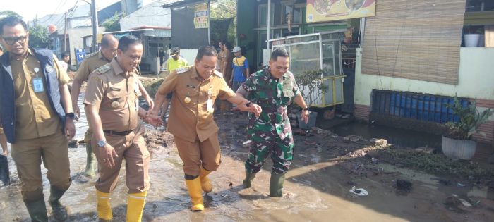 PJ. Wali Kota Tangerang Dr. Nurdin yang di dampingi Danramil 06/CBD meninjau langsung lokasi banjir di Perum Garden City Kelurahan Gebang Raya, Kecamatan Karawaci Kota Tangerang, Senin (25/11/2024).