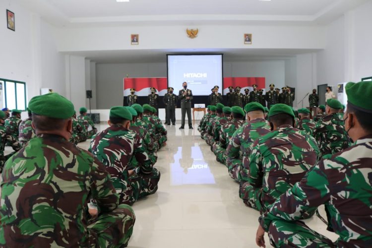 PANGKALPINANG -Usai memimpin korp raport kenaikan pangkat, Danrem 045/Garuda Jaya Brigjen TNI M Jangkung Widyanto, S.I.P., M.Tr.(Han) memberikan pengarahan (Jam Komandan) kepada prajurit dan PNS yang bertugas di Makorem, Jumat 01/10/2021 di Aula Makorem.