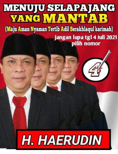 Mendapat nomor 4 (4) H.Haerudin (H.Edeng) sapaan akrabnya bersama masyarakat siap memajukan Desa Selapajang Kecamatan Cisoka, Kabupaten Tangerang. Sebagai calon kades dirinya sudah mempersiapkan berbagai macam program yang akan direalisasikan bila dirinya terpilih kembali menjadi Kepala Desa Selapajang.