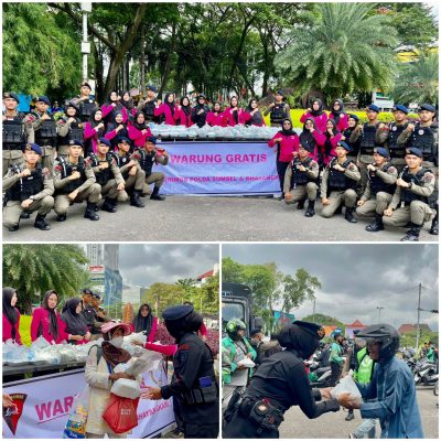 Persindonesia.com Simsel, Personel Korps Brimob Polda Sumsel bersama dengan Bhayangkari membagi-bagikan nasi kotak gratis kepada warga masyarakat Kota Palembang yang melintas di simpang lima DPRD Prov. Sumsel, Jln. Kapten A. Rivai, Kec. Ilir Barat I, Kota Palembang. Rabu (15/3/2023).
