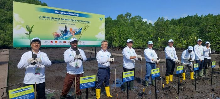 Persindonesia.com Denpasar – Tak hanya melakukan pertemuan, para delegasi 26th Inter-Islands Tourism Policy (Itop) Forum di Bali, juga melakukan penanaman mangrove di Taman Hutan Rakyat (Tahura) Ngurah Rai, Minggu (22/6).
