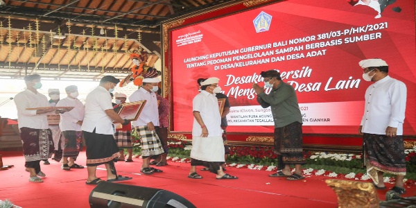 Persindonesia.com Gianyar – Launching Keputusan Gubenur Bali tentang Pedoman Pengolahan Sampah Berbasis Sumber di Desa/Kelurahan dan Desa Adat, sekaligus penyerahan penghargaan kepada 5 Desa yang sudah bisa menerapkan TPS3R dilaksanakan di Desa Taro, Tegallalang, Gianyar pada Jumat (9/4/21).