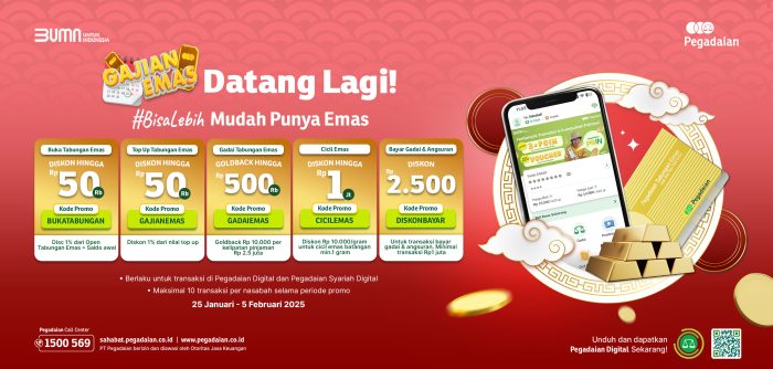 Jakarta, Jumat 7 Februari 2025 – Tinggal 2 Hari lagi! Pegadaian berikan promo Gajian Emas melalui aplikasi Pegadaian Digital. Berbagai promo bulanan yang bisa dimanfaatkan oleh nasabah ini berlangsung setiap tanggal 25 hingga 5 setiap bulannya. Melalui promo ini, Pegadaian sekaligus mengajak masyarakat untuk lebih melek dalam berinvestasi.
