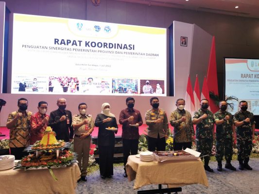 Forkopimda Jawa timur Gubernur Jawa Timur Khofifah Indar Parawansa, Kapolda Jatim Irjen Pol Nico Afinta, Kapoksahli Kodam V/Brawijaya Brigjen TNI Totok Suhartono, S.Sos yang mewalili Pangdam V/Brawijaya bersama Kepala Kantor Wilayah BPN Jatim Ir H Jonahar, M. Ec.Dev dengan dihadiri bapak mentari Agraria Hadi Tjahjanto, serta dihadiri stakeholder terkait diantaranya Sekda Prov Jatim Wahid Wahyudi, Danlanud Iswahjudi Marsma TNI M. Untung Suropati, Danlanud Abdul Rachman Saleh Marsma TNI Zulfahmi, S.Sos.,M.Han, Bupati/Walikota sejawa timur, Dandim jajaran Kodam V/Brawijaya, Kapolres jajaran Polda jawa timur, Kepala Kejaksaan Negeri sejawa timur, Kepala Kantor Pertanahan Kab/Kota sejawa timur dan Kepala Pengadilan Agama sejawa timur , Jum’at (1/7 /2022) menggelar Rakor di Surabaya bertemakan “Penguatan sinergitas pemerintah provinsi dan pemerintah daerah, serta seluruh stakeholder melalui forum GTRA dan Pola Trijuang menuju Jawa Timur lengkap untuk mewujudkan kesejahteraan rakyat.”