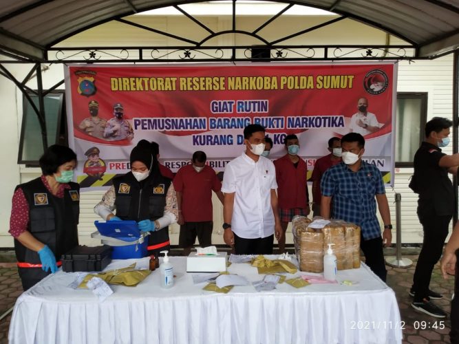 Persindonesia.com Medan – Direktorat Narkoba Polda Sumut kembali melaksanakan kegiatan rutin pemusnahan barang bukti Narkoba kurang dari 1kg hasil tangkapan. Selasa (02/11/21)