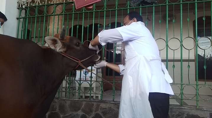 “Setelah kita lihat dan amati dengan cermat 5 sapi di Masjid Tanbihul Ghofilin Surabaya Alhamdulillah semua dalam kondisi sehat, cek mulut sapi dan kuku kaki sapi aman dan sehat,” kata dokter Hewan Aristono Kabid DKPP Peternakan Pemkot Surabaya.