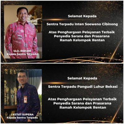 Dua UPT Kemensos yang memperoleh penghargaan yaitu Sentra Terpadu Pangudi Luhur Bekasi yang dipimpin oleh I Ketut Supena dan Sentra Terpadu Inten Soeweno Cibinong, Bogor yang dipimpin oleh MO. Royani.