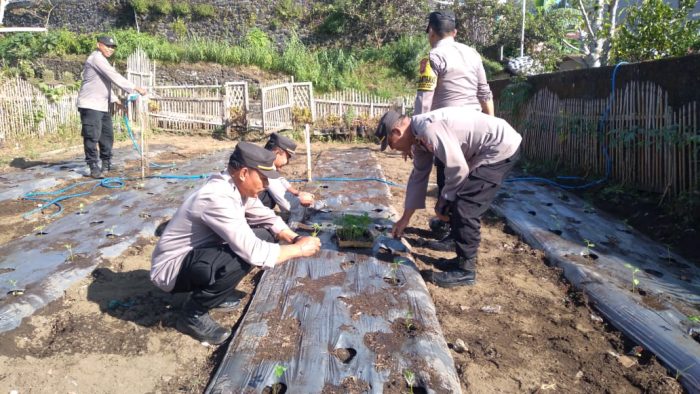 Wakapolsek Kintamani AKP I Nyoman Somaada didampingi Kanit Binmas Polsek Kintamani Iptu I Dewa Ketut Ngurah bersama anggota Polsek Kintamani melakukan penanaman sayur Jenis terong serta tanaman Cabai dengan ditanam ditanah memakai mulsa plastik, umur tanaman sampai menghasilkan diperkirakan dua bulan dimana selama masa itu tanaman tersebut perlu dirawat dan dipupuk, penanaman tanaman sayur tersebut sebagai bentuk program ketahanan pangan yang di galakkan oleh pemerintah serta Polsek Kintamani turut menunjang progran tersebut.