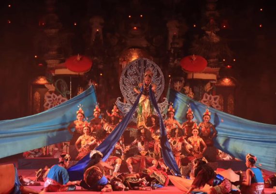 Puncak penampilan itu digambarkan terjadi gelombang besar membawa musibah terhadap masyarakat. Hingga kemunculan Kanjeng Ratu memperingatkan masyarakat akan kesalahan mereka, masyarakat tersadar dan memohon pengampunan. Untuk menghormati Kanjeng Ratu sebagai penguasa lautan maka didirikan sebuah pura di tepi pantai di daerah Cekik di kabupaten Jembrana.
