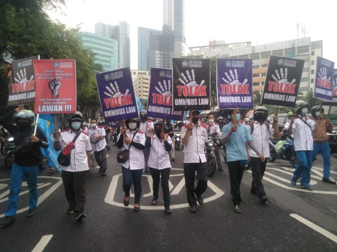 Tampak beberapa lembaga buruh yang tergabung dalam Gasper (gerakan serikat pekerja Jawa Timur) ada 3 titik yang mereka kunjungi yaitu kantor Gubernur Jawa Timur, Gedung Grahadi dan kantor Pemkot Surabaya.
