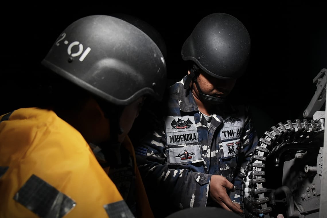 Sejumlah prajurit TNI AL tampak bersiap menyiapkan senjata serta amunisi di atas KRI Teluk Ende-517. Dibawah kemerlip bintang-bintang langit, para prajurit TNI AL tanpa kesulitan menyiapkan pos tempurnya sesuai yang diperintahkan meski dengan penerangan yang minim pada saat keadaan kapal gelap gulita.