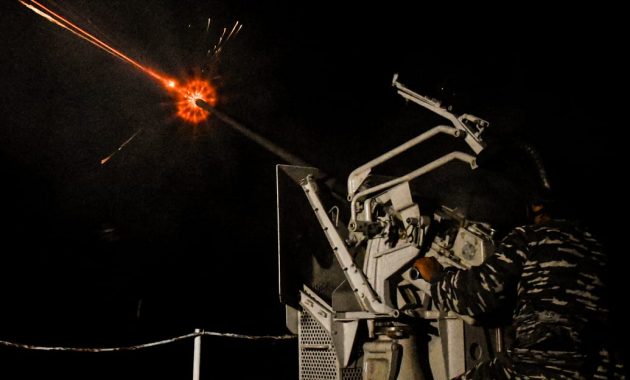 Keheningan malam seketika dipecahkan oleh suara letusan senjata. Saat meriam berkaliber 40 mm itu mulai melesat ke udara. Percikan cahaya pun keluar dari ujung laras senjata itu, disusul rentetan senjata Mitraliur 20 mm menuju sasaran dengan mengeluarkan cahaya yang kemudian seolah-olah menghiasi langit yang gelap
