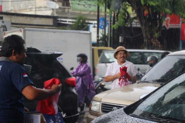 Tampak puluhan anggota Badan Kesatuan Bangsa dan Politik (Kesbangpol) Provinsi Bali dipimpin langsung oleh Kepala Badan Kesbangpol Provinsi Bali Dewa Putu Mantera membagikan bendera merah putih di Jalan By Pass Ngurah Rai, tepatnya di perempatan simpang KFC Desa Sanur Denpasar Selatan, Rabu, Buda Pon Wuku Medangkungan (10/8).