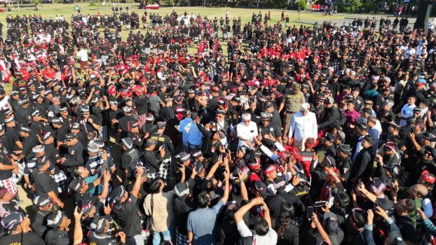 Gubernur Bali didampingi jajaran Forkopimda hadir langsung di tengah tengah belasan ribu pecalang Bali dari Kabupaten/kota se Bali seraya memekikkan yel-yel mendukung dan menyemangati pecalang Bali untuk bersama -sama menjaga Gumi Bali aman, damai dan tentram.