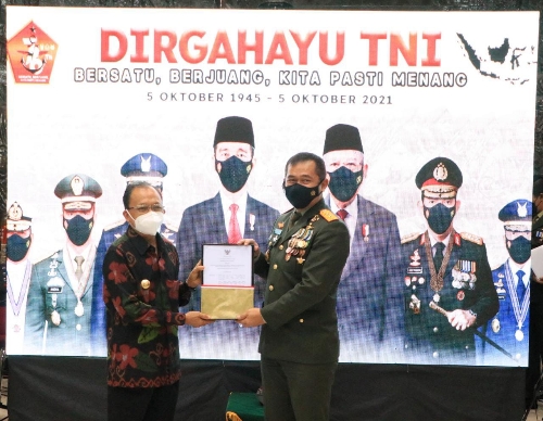 Denpasar – Gubernur Bali Wayan Koster menyerahkan sertifikat tanah hibah seluas 1,7 hektar (ha) kepada Pangdam IX/ Udayana Mayjen TNI Maruli Simanjuntak yang akan digunakan untuk pembangunan perumahan bagi prajurit TNI AD, Selasa (5/10) di Hall Makodam IX/ Udayana, Denpasar, serangkaian Peringatan HUT TNI ke-76.