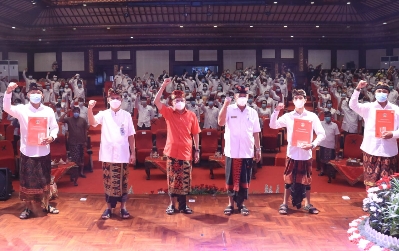 Persindonesia.com Denpasar – Gubernur Bali Wayan Koster menyerahkan secara simbolis Surat Keputusan(SK) pengangkatan Calon Pegawai Negeri Sipil (CPNS) formasi 2019 di lingkup Pemerintah Provinsi Bali, yang digelar secara hybrid (offline dan online) di panggung tertutup Gedung Ksirarnawa, Taman Budaya Art Centre Denpasar pada Rabu ( 6/1) pagi.