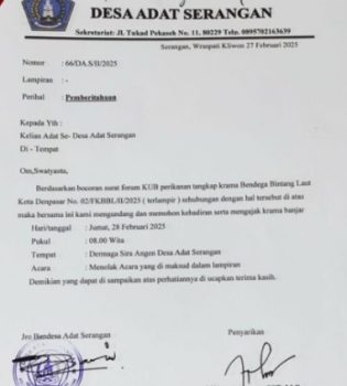 Serangan Denpasar (persindonesia.com) – Rencana pertemuan delapan kelompok nelayan Serangan yang tergabung dalam Forum KUB Perikanan Tangkap Krama Bendega Bintang Laut Kota Denpasar terpaksa ditunda. Hal ini menyusul adanya surat penolakan dari Bendesa Adat Serangan yang diterbitkan pada 27 Februari 2025.