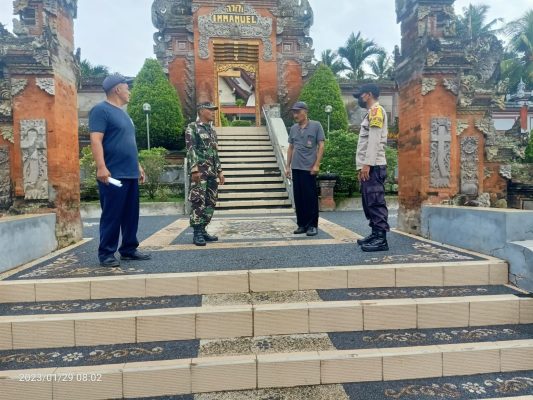 Persindonesia.com Jembrana, Babinsa Desa Blimbingsari Koramil 1617-03/Melaya Sertu Kadek Wirawanta melaksanakan kegiatan pengamanan saat berlangsungnya Ibadah Minggu Umat Nasrani di GKPB Gereja “Pniel” Blimbingsari dan Gereja “Immanuel” Ambyarsari Desa Blimbingsari, Kecamatan Melaya, Kabupaten Jembrana, Minggu (29/01/2023)