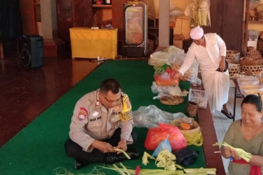 Pada kesempatan tersebut Aiptu Murdana tampak membantu pembuatan sarana banten mejahitan dalam rangka persiapan upacara piodalan, Kamis (27/6/2024) pagi.