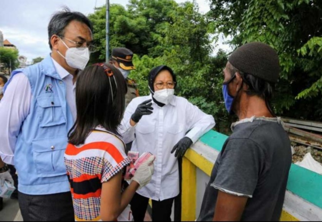 Dengan rombongan kecil, Risma berhenti di kawasan aliran Sungai Ciliwung, di belakang kantor Kemensos.