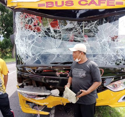 Persindonesia.com Jembrana – Demi menghindari rombongan sepeda motor Kawasaki Ninja yang nyalip, bus pariwisata merk Hino Jet Bus 3 warna kuning menabrak bus pariwisata merk Hino Jet Bus 3 warna merah yang merupakan temannya yang ada di depan mengakibatkan bagian depan bus ringsek dan kaca depannya pecah, sedangkan bus didepan, bagian belakang bus juga ringsek kaca belakangnya pecah. Sabtu (5/2/2022).