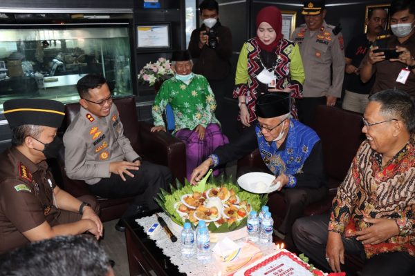 Beriringan mereka membawa tumpeng, kue tart, bertuliskan HUT Bhayangkara ke-76. Lengkap, bersamaan menyanyikan lagu ” Selamat Ulang Tahun”.