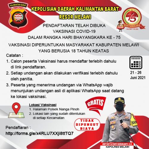 Dalam rangka memperingati HUT Bhayangkara ke-75, Polres Melawi menggelar kegiatan vaksinasi covid-19 massal. Kegiatan ini dilaksanakan selama 21-26 Juni 2021 di Halaman Polsek Nanga Pinoh dan lokasi lain yang sudah ditentukan di setiap kecamatan.