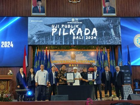 Kegiatan Uji Publik Pilkada Bali 2024 diinisiasi BEM Unud dan didukung penuh Rektorat Unud. Wakil Rektor IV Bidang Perencanaan Kerjasama dan Informasi Unud Prof. Dr. dr. I Putu Gede Adiatmika, M.Kes mewakili rektor membuka kegiatan ini. Bertindak sebagai Moderator, Dr. Kadek Dwita Apriani, S.Sos, M.I.P. Tiga panelis yakni Prof Suka Arjaya, Prof I Wayan Suarna, dan Ketua BEM Unud I Wayan Tresna Suwardiana. (*)