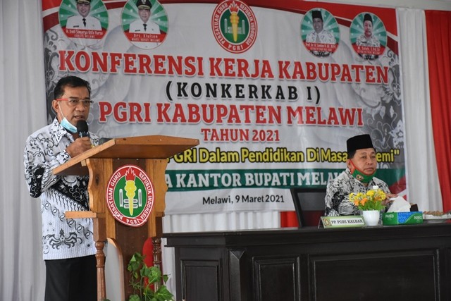 Persatuan Guru Republik Indonesia (PGRI) Kabupaten Melawi melaksanakan Konferensi Kerja Kabupaten ke I Tahun 2021 di Aula Kantor Bupati Melawi, Selasa (09/03/2021).