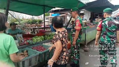 Kodam Jaya, Tangerang,Persindonesia.com – Upaya mengantisipasi lonjakan harga dan kelangkaan bahan sembako menjelang hari raya Idul Fitri (Lebaran) 1444 tahun 2023, Babinsa Koramil 01/Tgr, Kodim 0506/Tgr Sertu Gayot melaksanakan pemantauan harga sembako yang ada di pasar tradisional Pasar lama dan pasar Babakan Kota Tangerang, Rabu (12/10/2023).