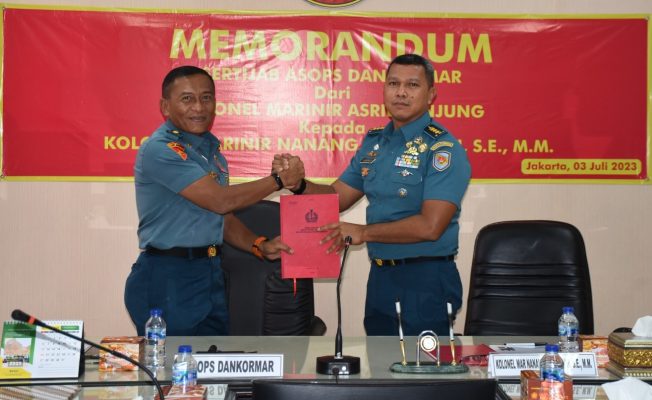Persindonesia.com TNI AL Dispen Kormar (Jakarta). Menjelang dilaksanakannya Serah Terima Jabatan Asisten Operasi Komandan Korps Marinir (Asops Dankormar), dilaksanakan pembacaan memorandum dari pejabat lama Kolonel Marinir Asril Tanjung kepada pejabat baru Kolonel Marinir Nanang Saefulloh. S.E., M.M di ruang rapat Staf Operasi Mako Kormar, gedung Agoes Soebekti, Jl. Prapatan No. 40 Jakarta Pusat, Senen (03/07/2023).