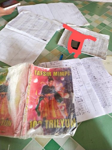 Pantauan awak media, disalah satu warung di Desa Kusau Makmur Tapung Hulu, ditemukan buku tapsir mimpi warna merah sampul plastik warna putih,buku rekapan nomor  yang terjual dan nilainya, HP, pena yang terletak di meja warung,19 -05-2021.