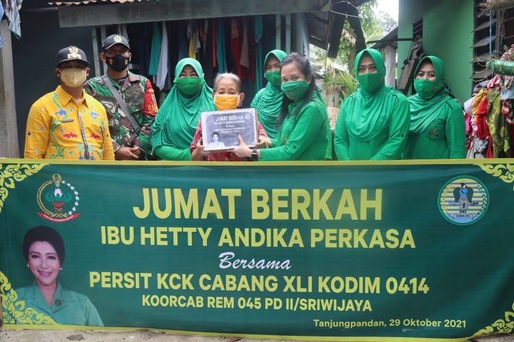 Tanjungpandan – Bertempat di Wilayah Kecamatan Tanjungpandan Kabupaten Belitung,Jumat 29/10/2021 telah berlangsung kegiatan Jumat Berkah Ibu Hetty Andika Perkasa bersama Persit KCK Cabang XLI Kodim 0414/Belitung Koocab Rem 045/Gaya PD II/Sriwijaya.