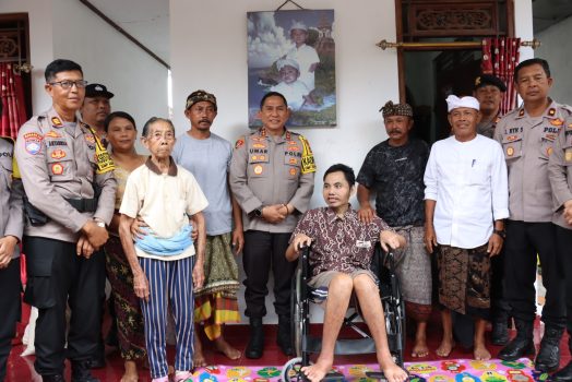 Seusai penyerahan kursi roda Kapolres Gianyar didampingi jajarannya melakukan foto bersama dengan Nyoman Sedeng serta keluarga yang mendampinginya.