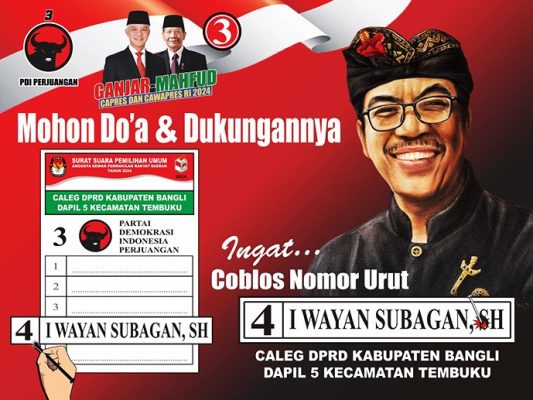 PersIndonesia.Com,Bangli- Calon Legislatif (Caleg) PDIP dari Daerah Pemilihan (Dapil) Kecamatan Tembuku Bangli, I Wayan Subagan, SH siap berkompetisi dalam Pemilihan Legislatif (Pileg) DPRD Bangli tahun 2024. Kesiapan itu semakin menguat setelah secara resmi dirinya lolos verifikasi hingga memperoleh urutan empat (4) dalam surat suara Pemilihan Legislatif (Pileg) DPRD Bangli dari PDIP