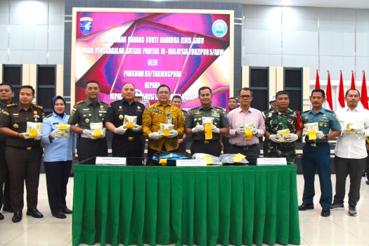 Penyerahan Narkotika Jenis Sabu-Sabu seberat kurang lebih 10,5493 kg dari Pangdam XII/ Tpr Mayjen TNI Iwan Setiawan kepada Kepala BNN Kalbar Sumirat Dwiyanto disaksikan para Forkopimda dan para pejabat terkait se-Kalimantan Barat serta para awak media.