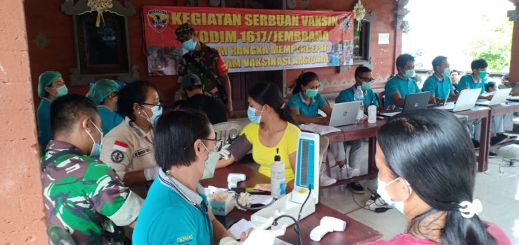 Persindonesia.com Jembrana – Kodim 1617/Jembrana bekerja sama dengan Dinas Kesehatan Kabupaten Jembrana terus berupaya mengejar tercapainya target program Vaksinasi di wilayah Kabupaten Jembrana melalui serbuan Vaksinasi diberbagai tempat. Serbuan Vaksinasi difokuskan bagi masyarakat yang belum menerima Vaksinasi tahap ketiga (Booster).