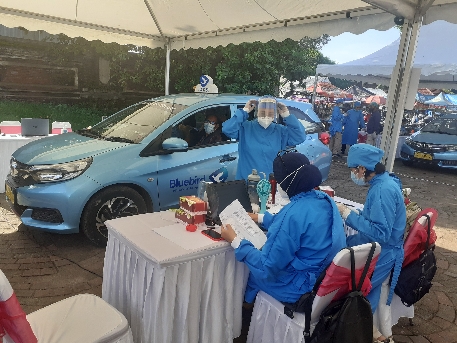 Kapolda Bali, Irjen Pol Putu Jayan Danu Putra meninjau lngsung pelaksanaan vaksinasi massal secara drive thrue yang dijalani oleh 700san lebih driver taksi Blue Bird, yang mulai pada Sabtu pagi 27 Maret 2021 hingga selesai.