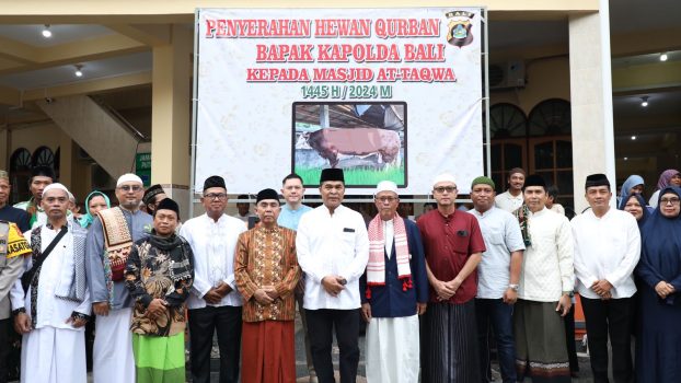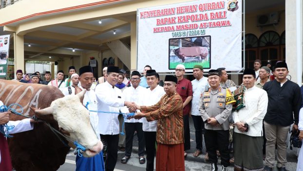 Bali – Kepala Kepolisian Daerah Bali, Irjen. Pol. Ida Bagus Kd Putra Narendra, S.I.K., M.Si., bersama PJU Polda Bali, serahkan sapi qurban dalam rangka hari raya Idul Adha 1445 H / 2024 M., bertempat di Masjid At Taqwa Polda Bali, pada Senin 17 Juni 2024.